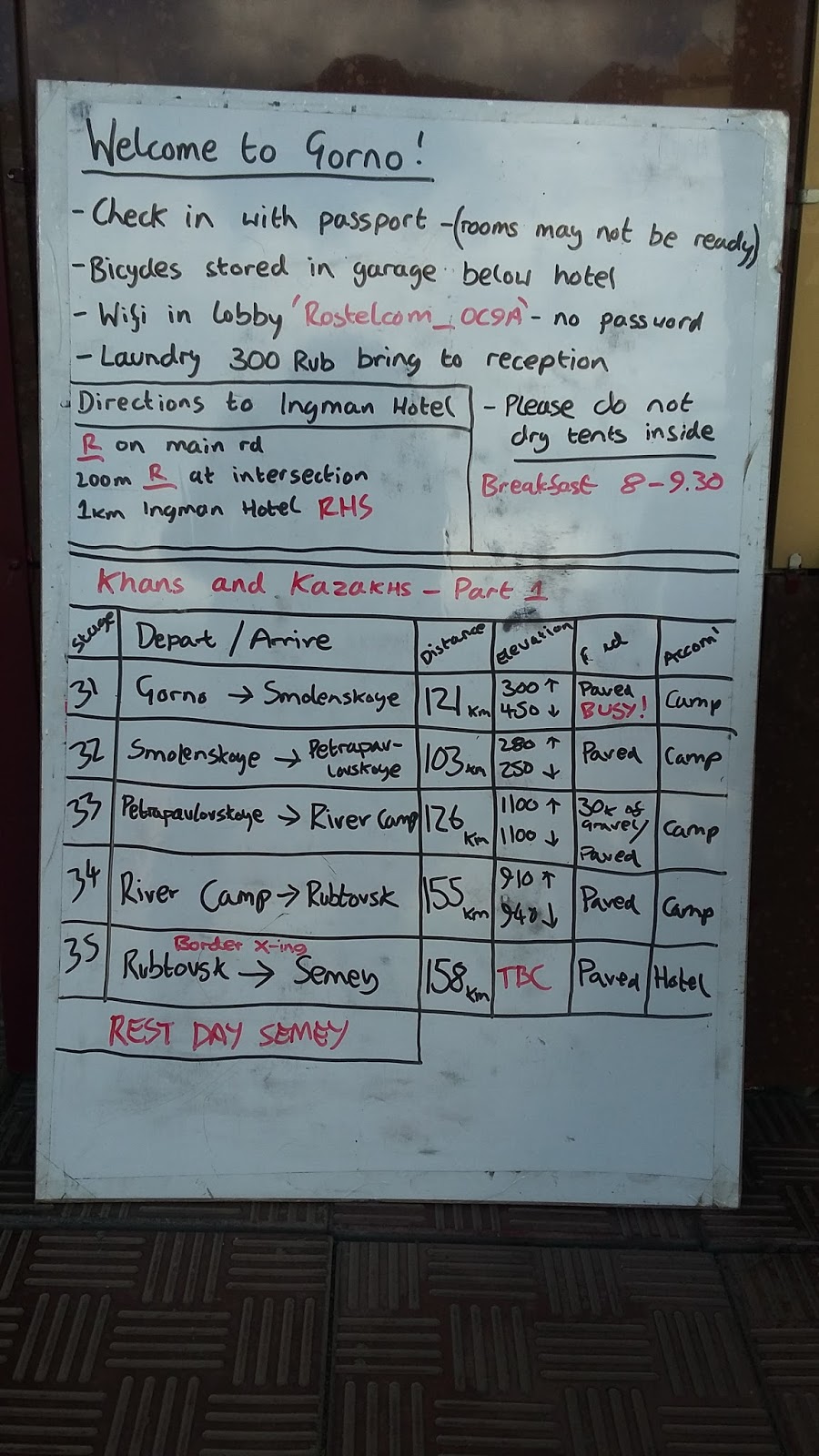 Nous voici arrivés à Gorno après 7 jours de vélo au cours desquels nous avons quitté la Mongolie et fait notre entrée en Russie. Cette Sibérie orientale est beaucoup plus jolie que je l'imaginais: c'est un mélange de beautés de Colombie-Britannique, du Maine, des